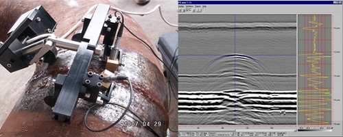 In a TOFD system, a pair of ultrasonic probes sits on opposite sides of a weld. One of the probes, the transmitter, emits an ultrasonic pulse that is picked up by the probe on the other side, the receiver. In undamaged pipes, the signals picked up by the receiver probe are from two waves: one that travels along the surface and one that reflects off the far wall. When a crack is present, there is a diffraction of the ultrasonic wave from the tip(s) of the crack. Using the measured time of flight of the pulse, the depth of a crack tip can be calculated automatically by simple trigonometry. This method is even more reliable than traditional radiographic, pulse echo manual and automated weld testing methods.
